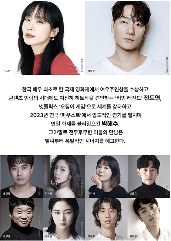 출연배우로는 여주인공 류바로 역으로 출연하는 전도연과 남주인공 냉철한 상인 로파힌 역으로 백해수가 출연 예정이다. 이외 배우들로는 손상규, 최의서, 이지혜, 남윤호, 유병훈, 박유림, 이세준, 이주원 등이 연극에 출연하는 역대급 캐스팅이다.