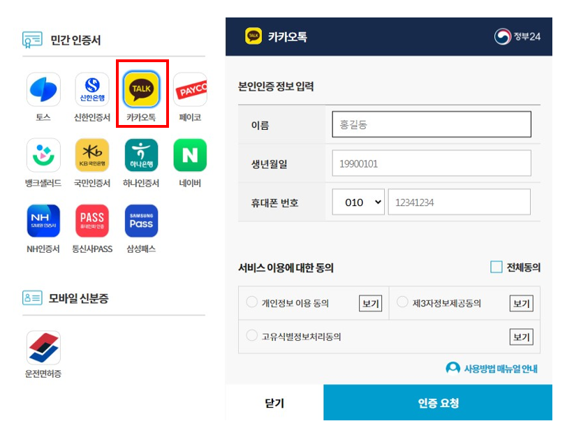 카카오톡을 이용한 간편 인증