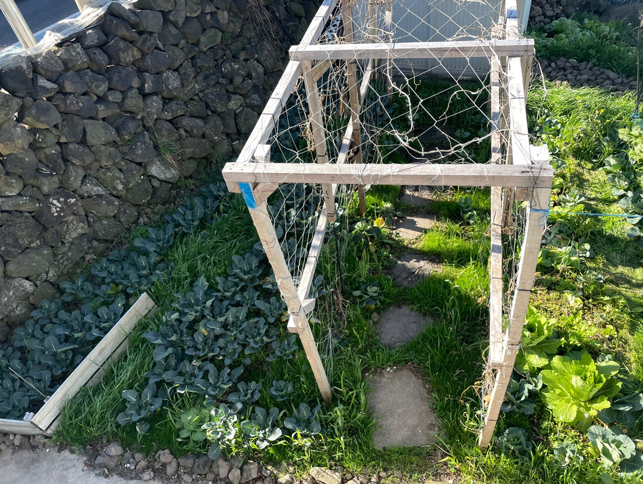 위 사진은 텃밭에 일부분으로 왼쪽에는 브로콜리와 터널 안에는 케일 대파 양파 등이 함께 자라고 있으며, 오른쪽에는 양배추와 배추 그리고 치커리 양파 등이 추운 겨울을 잘 버티고 자라고 있습니다. 저는 터널 옆으로 완두콩을 심을 예정입니다.
